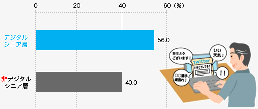 以上の結果から、デジタルシニアは非デジタルシニア層に比べ社交性が高く、周囲の人々に対し積極的に情報発信をする傾向があり、"情報伝播力"が大きいと推察されます。