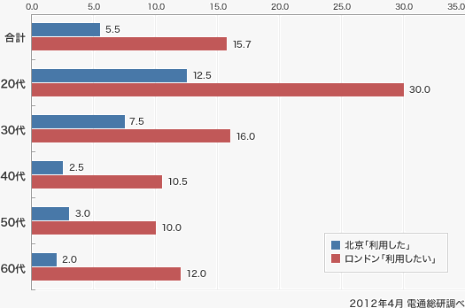 開催期間前には、インターネット上の専門サイトに応援する映像を投稿してもらうことで選手を元気づけようという試みを行 なったほか、開催期間中になると競技に参加した選手からのメッセージを閲覧できる仕組みを構築しました。他にも視聴者同士で放送を視ながら選手を応援する といった機能を搭載した「視聴者参加型アプリケーション」によって、ライブ視聴ならではの楽しみと興奮を提供するという取り組みも生まれています。電通総 研が行なった調査でも「オリンピック中、試合を観戦しながらソーシャルメディアを利用したい」と回答した人が全体の15.7%存在しました。若年層ほどそ の傾向が強く、特に20代は30.0%が「Yes」と回答しました。ロンドンオリンピックをリアルタイムでテレビ観戦しながら、ソーシャルメディアを利用 する若年層が大きく増えるでしょう。