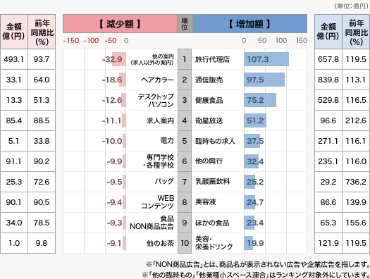 旅行代理店や通信販売、健康食品などが大幅に増加。一方で求人以外の案内やヘアカラーなどが減少しました。
