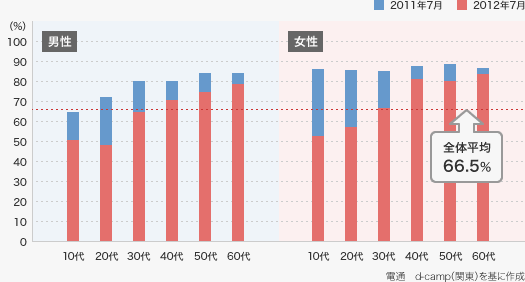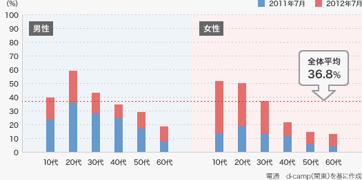 2012年7月のデータですが、対象者全体でのスマホ利用率は36.8%(前年19.9%)となっており、飛躍的に利用率が拡大したことがよくわかります。なかでも牽引役となっているのが女性層で、特に10代・20代の若年層の伸びが驚異的であることが一目瞭然となっています。