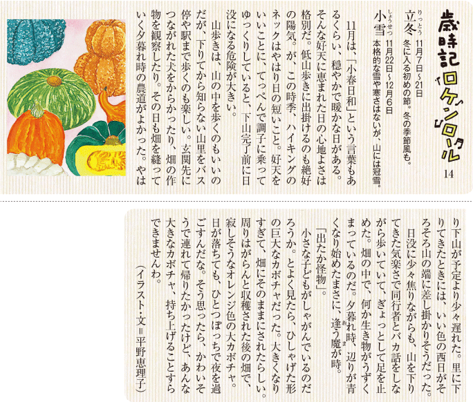 公開日: 2013/12/050歳時記ロケンロール#14 【立冬】【小雪】#月刊電通報前の記事次の記事 イラスト・文=平野恵理子 #18 歳時記ロケンロール【啓蟄】【春分】 #17 歳時記ロケンロール【立春】【雨水】 #16 歳時記ロケンロール【小寒】【大寒】 #15 歳時記ロケンロール【大雪】【冬至】 #14 歳時記ロケンロール【立冬】【小雪】 #13 歳時記ロケンロール【寒露】【霜降】