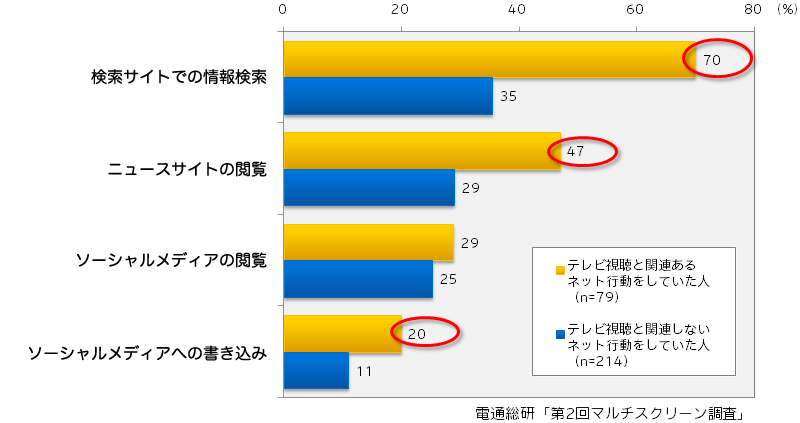 このように、調査の結果からみると、テレビを視聴することがきっかけとなり、検索サイト・ニュースサイト・ソーシャルメディアなどのネット利用が同時に活発になる場合が確かにあることが分かります。