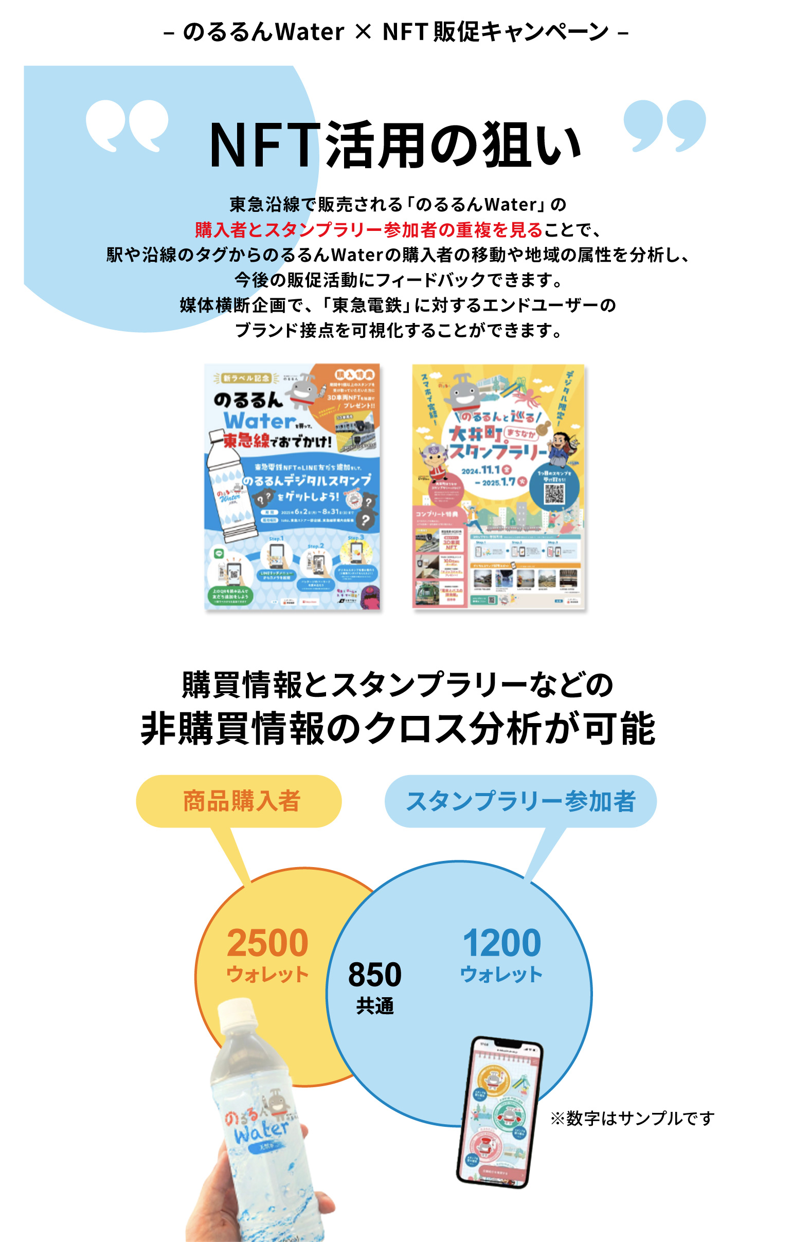 さらに、デジタルスタンプラリーにとどまらず、東急ストア(一部店舗)、toks、東急線駅構内自販機で販売されている「のるるんWater」のラベルにも、NFT取得に必要となる東急電鉄NFT公式LINEアカウントのQRコードを掲載。街歩き(回遊)と購買という異なる行動を、ひとつの体験としてつなげました。