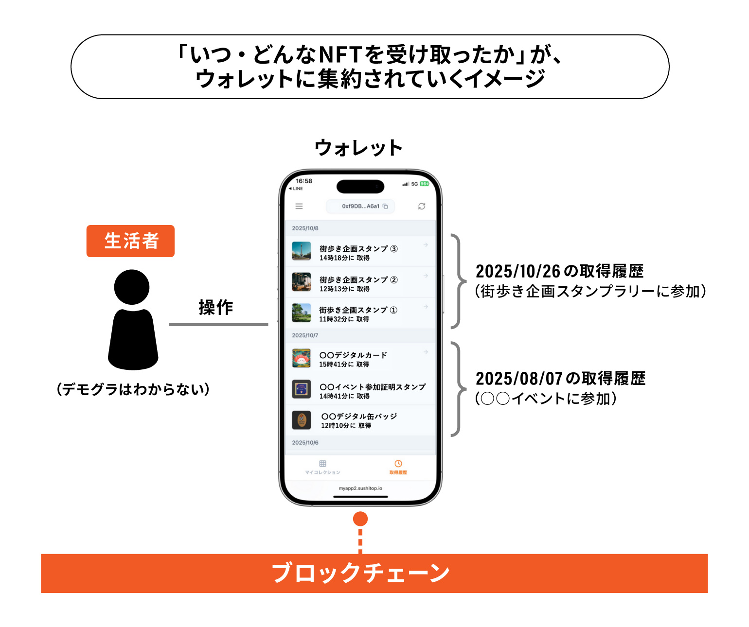 このウォレットには個人情報は含まれません。誰のものかを特定できない匿名性を保ちながら、行動履歴を可視化できるのが特長です。
