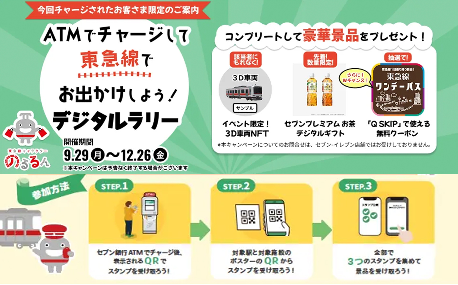 加えて、接点の拡張として、セブン銀行ATMと連携したスタンプラリーも展開しています。ATMで交通系電子マネーをチャージするとNFTスタンプを取得できる仕組みを導入し、駅や街、ATMといった日常動線上の顧客接点をつなぐことで、“移動を軸にした関係づくり”をより立体的に広げています。