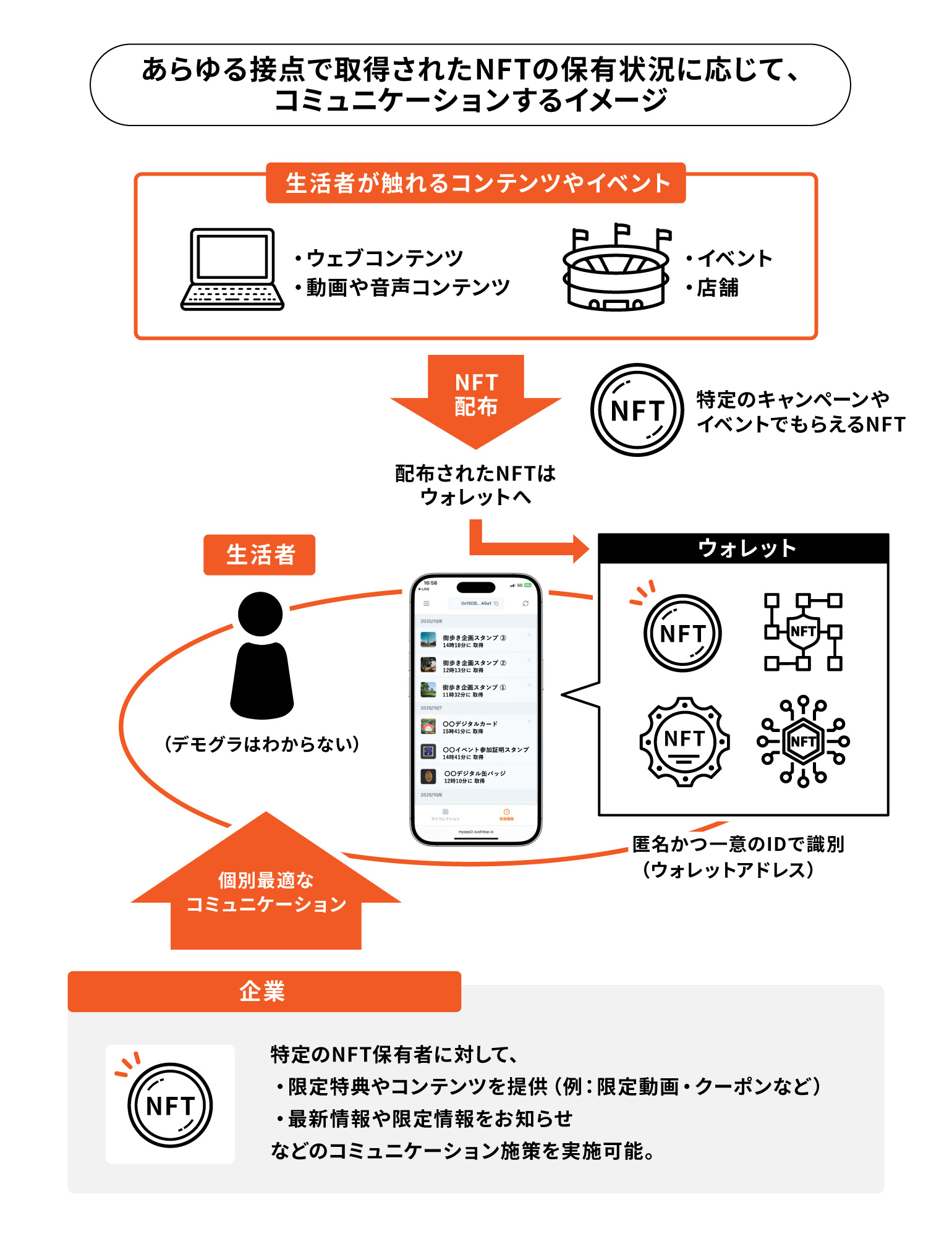 企業は、各ウォレットに記録された情報、つまり「そのウォレットがどのNFTを保有しているか」を参照できます。そうすることで、「Aというキャンペーンに参加した人が、Bというイベントにも参加している」といったように、異なる施策をつないだ体験の流れを横断的に把握できるようになります。