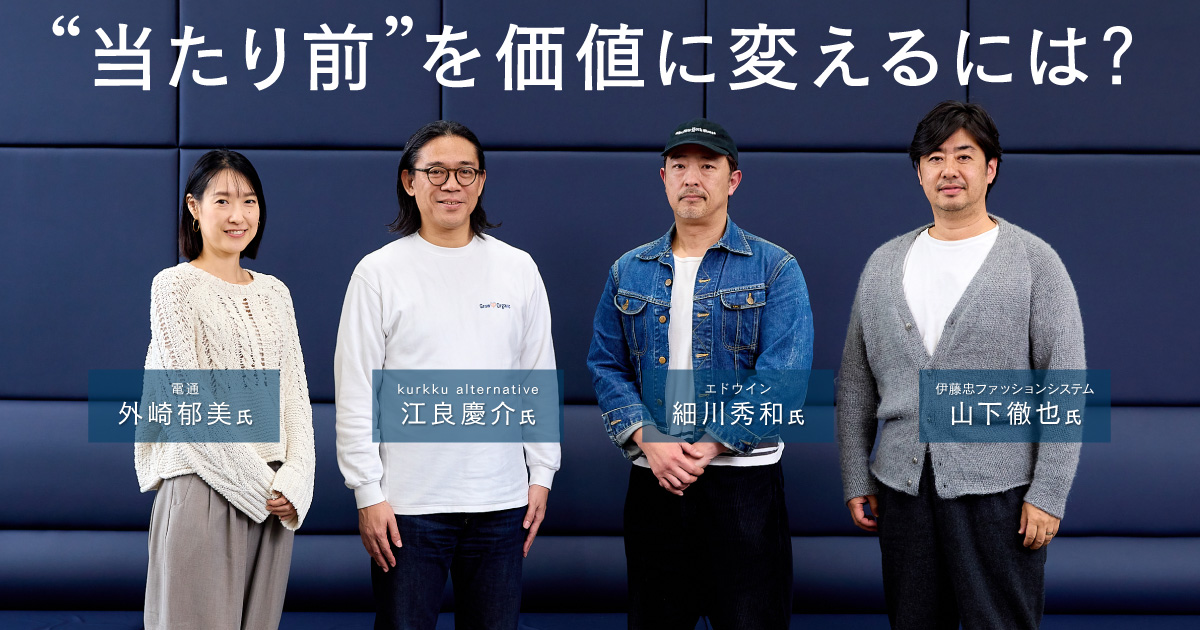 今回は、Re-Creationの認証を取得したエドウイン クリエイティブディレクターの細川秀和氏、Grow Organicを運営するkurkku alternative代表取締役社長の江良慶介氏をゲストに迎え、伊藤忠ファッションシステム ifs未来研究所/Re-Creation専務理事の山下徹也氏と、Re-Creationのコミュニケーションに伴走する電通 クリエイティブディレクターの外崎郁美氏がお話を伺いました。